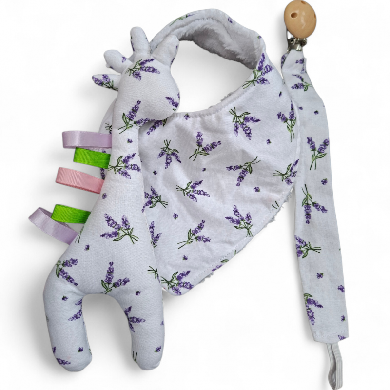 avec son bavoir, le hochet girafe et l'attache tétine